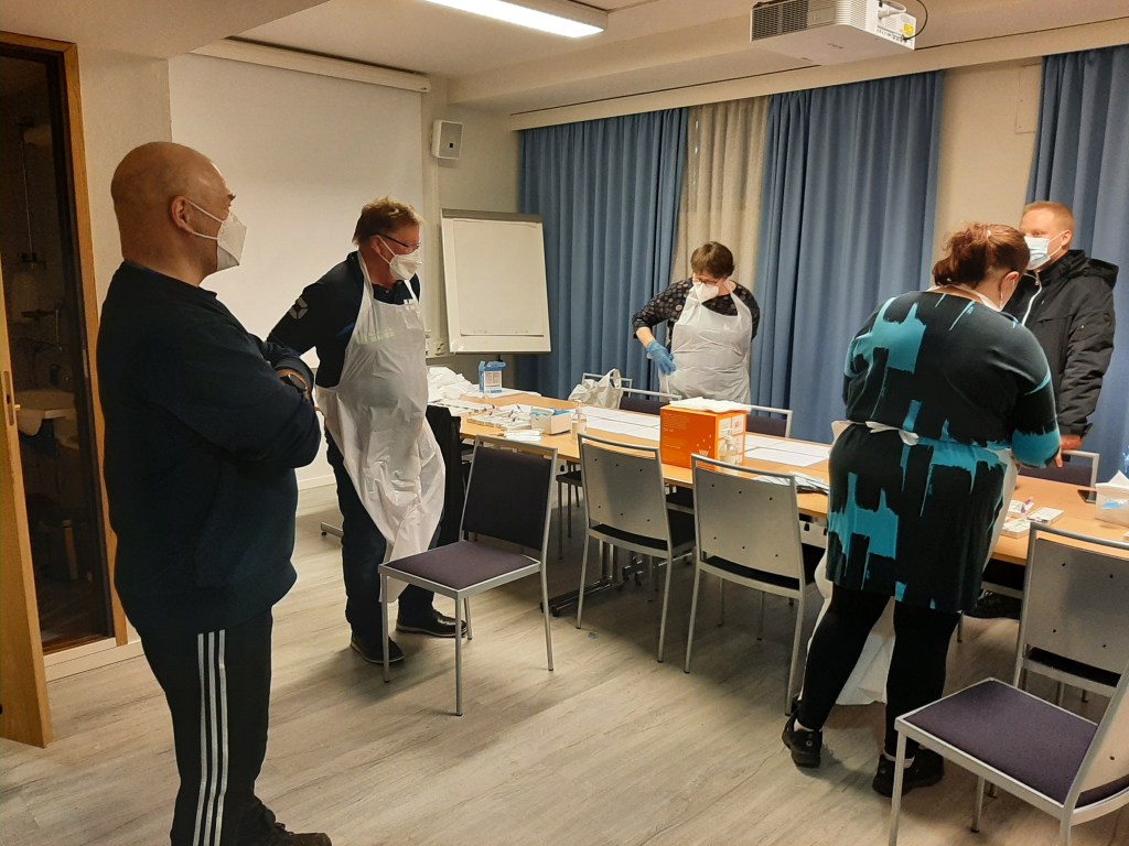 Herman Karen ulkomaisten joukkueiden painijoiden, valmentajien ja tuomareiden koronatestaukset on hoidettu. Kaikki testit oli negatiivisia… Tämä helpotti kovasti järjestäjiä. Kuvassa vasemmalla järjestelyorganisaatiosta ja Kouvolan Painijoiden hallituksen jäsen ja kisojen turvallisuudesta vastaava Jari Vuorijärvi, ensihoitaja ja kv. tuomari Timo ”Utu” Utriainen toimi toisena testaajana, (Jarin oikealla puolella) keskellä takana kisojen taloudesta vastaava ja KoPan hallituksen jäsen Helena Orpana ja oikealla varapj Joonas Hietala, joka vastaa mm. kisan kv. yhteyksistä, logistiikasta ja tuomareista. Joonaksen vasemmalla puolella ja selin kameraa lähihoitaja ja toinen testaaja Elina Huuhtanen. La-aamuna klo 07.00 alkaa suomalaisten painijoiden ja valmentajien koronatestaukset. Tämän jälkeen on kaikilla lääkärintarkastus, punnitus ja kaiken ollessa kunnossa, niin klo 10.30 alkaa painijalla kilpailut!